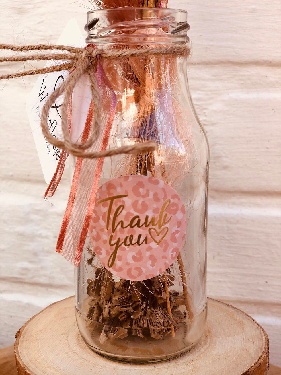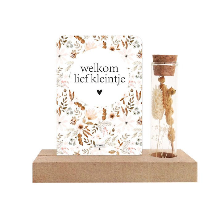 Kaarthouder en vaasje met droogbloemen "Welkom lief kleintje"